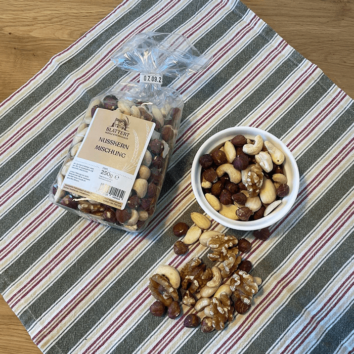Herrlich kernige Mischung aus Haselnüssen, Mandeln, Cashewkernen und Walnüssen.
