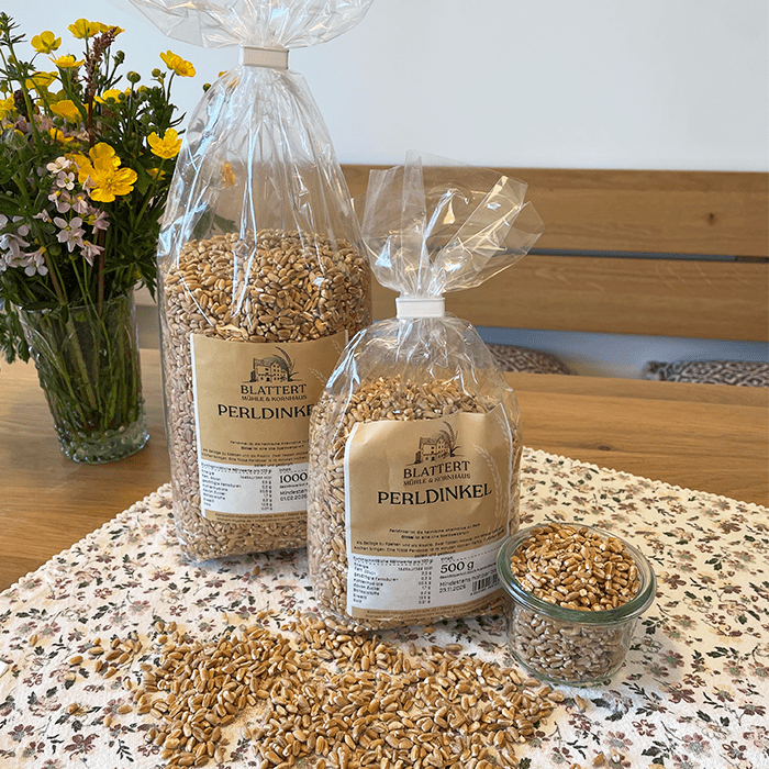 Als Beilage zu Speisen und als Risotto. Zwei Tassen Wasser mit etwas Salz zum Kochen bringen. Eine Tasse Perldinkel 12-15 Minuten kochen. Fertig.