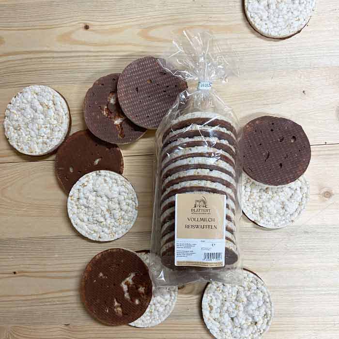 Gepuffte Reiswaffeln mit einem leckeren Fuß aus Vollmilchschokolade.